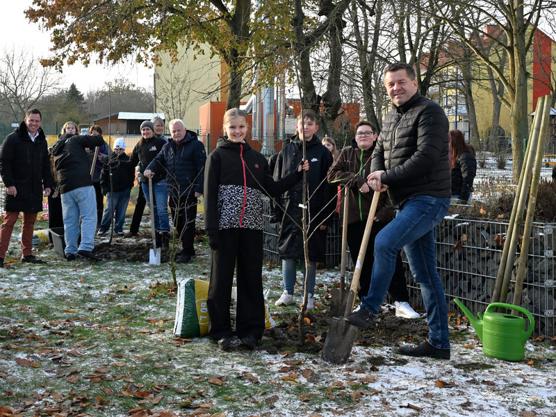 An der Sekundarschule A. S. Puschkin in Oschersleben hat das Obstanbau-Projekt jetzt sichtbare Wurzeln geschlagen: Auf einer zentralen Grünfläche wurden die ersten Obstbäume gesetzt. Wirtschafts- und Landwirtschaftsminister Sven Schulze ließ es sich nicht nehmen, selbst zum Spaten zu greifen und gemeinsam mit der Schulgemeinschaft zu pflanzen. Künftig spenden die Bäume Schatten für Feste und Pausen, liefern Ernte für die Schulküche und werden im Biologieunterricht zum greifbaren Anschauungsobjekt. Obstbäuerin Sabine Hornemann erklärte der Klasse 6a vorher praktische Kniffe zu Pflanzung und Pflege – vom richtigen Schnitt bis zum optimalen Zeitpunkt im Spätherbst. Möglich gemacht wurde die Aktion durch eine Kooperation von Obstbauverband, Obsthof Hornemann und dem Landwirtschaftsministerium.